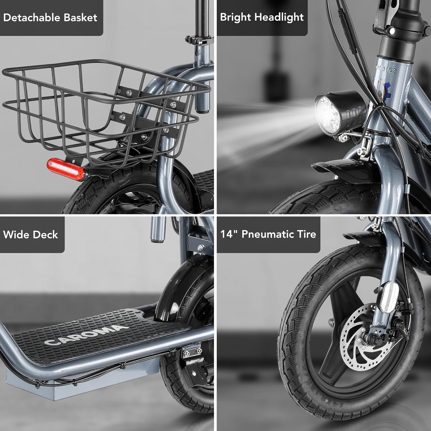【14-inch tires for comfortable riding】Caroma P6 electric scooter for adults is equipped with 14-inch rubber pneumatic tires, which can effectively absorb bumps during riding and provide you with a comfortable and smooth riding experience; equipped with a 9.5-inch wide deck to provide spacious space, you can always bring your pet when traveling; the adjustable saddle allows you to adjust the height according to your height and weight