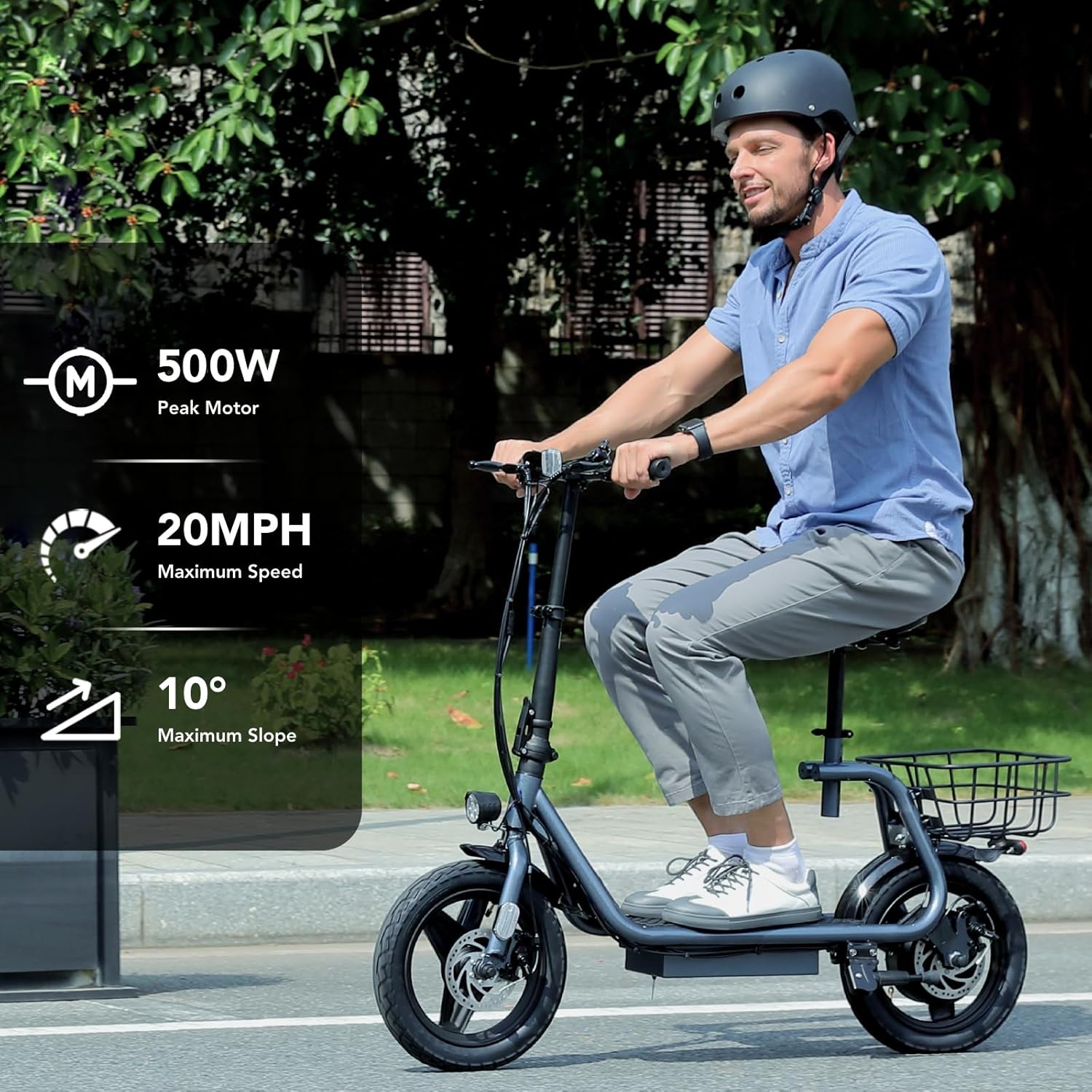 【Peak 500W Powerful Motor and 36V Durable Battery】The electric scooter with seat is equipped with a Peak 500W electric brushless hub motor, which can reach a maximum speed of 20mph; the maximum driving distance can reach 15 miles under certain conditions, and it only takes 4 hours to charge