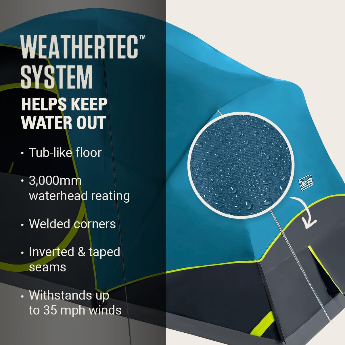 WeatherTec Protection: Water-resistant tub-like floor, patented welded corners & inverted seams
