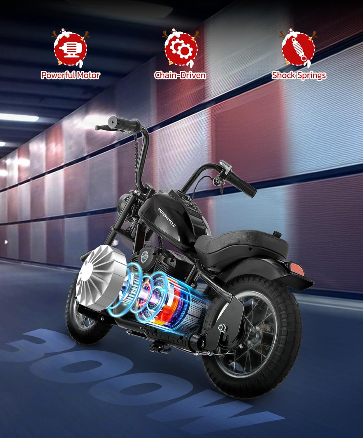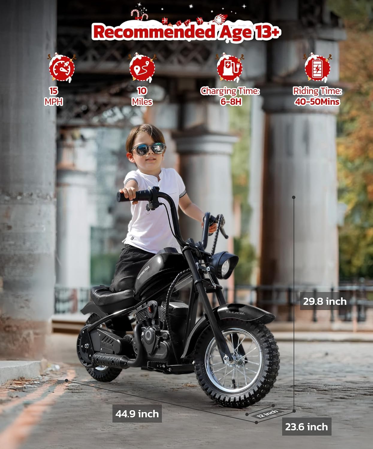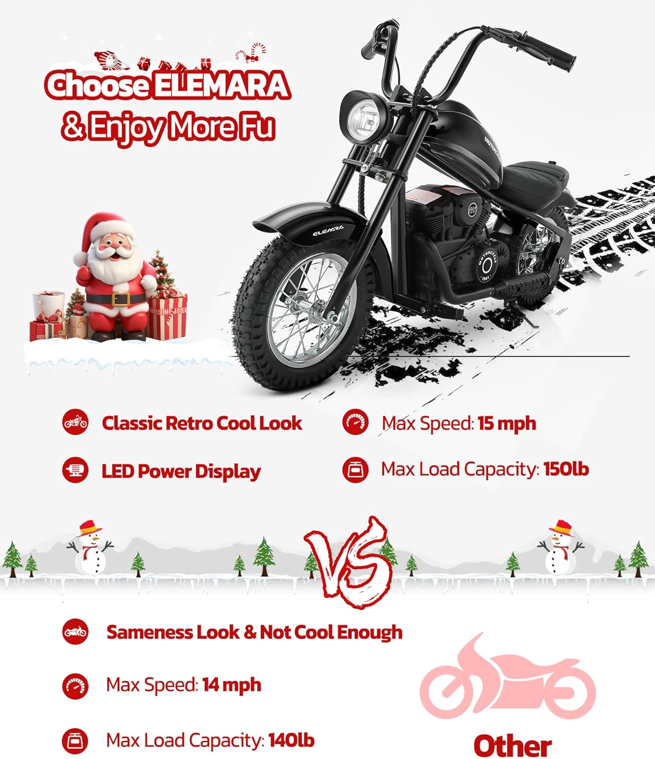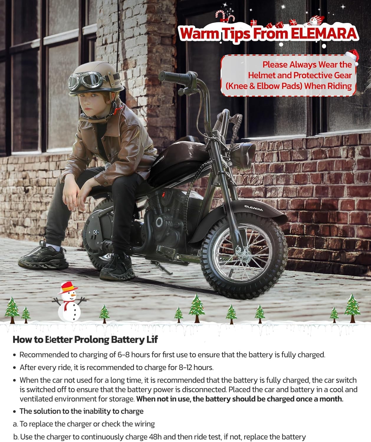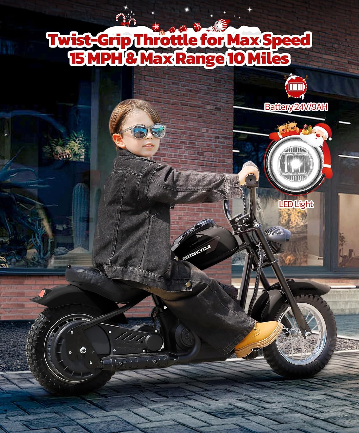 【High-Performance Electric Motorcycle】ELEMARA electric motorcycle for kids equipped with a 24V 250W powerful chain-driven motor, reaching speeds of up to 15mph and 10 Miles max range while its 150lb max weight capacity ensures fun for kids of various sizes.
