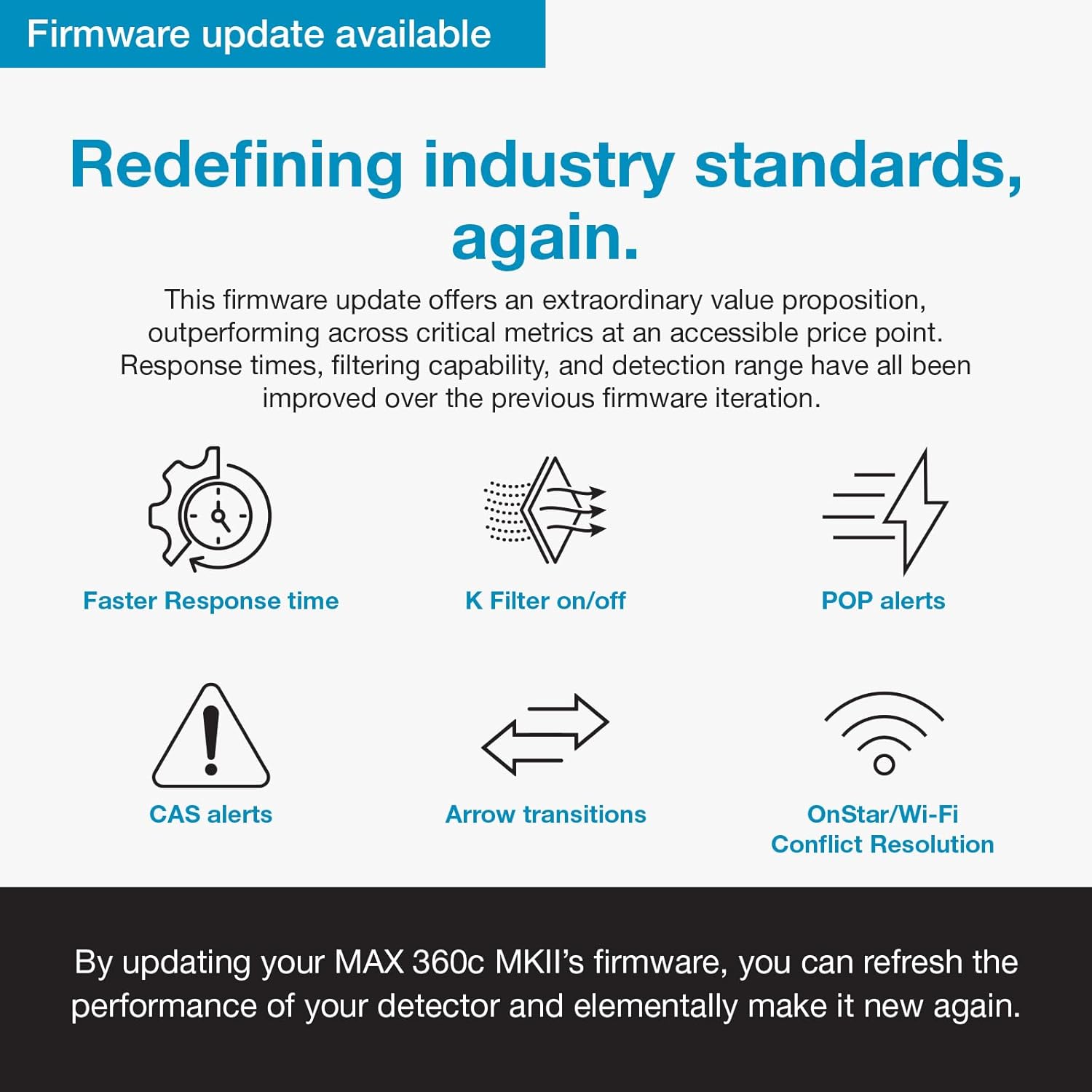 The Escort MAX 360c MKII is a high-performance radar and laser detector with advanced connectivity. We started with our legendary quality and ease of use and improved on it with the latest hardware available. The MAX 360c MKII radar detector now features an upgraded dual-antenna platform, Blackfin DSP chip, and dual-band Wi-Fi connectivity. The result is better detection performance delivered more quickly and fewer false alerts to distract you from your drive.