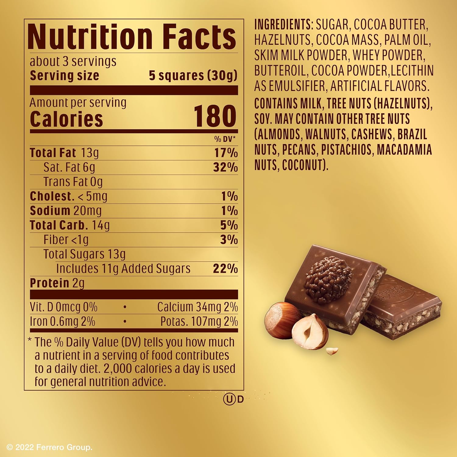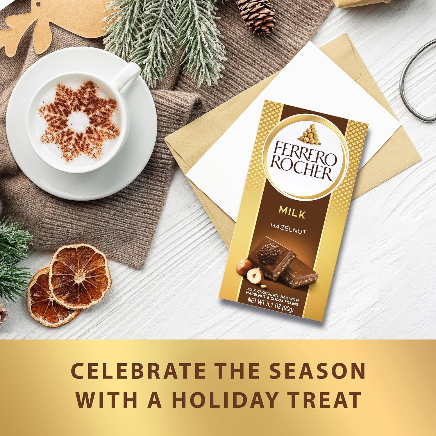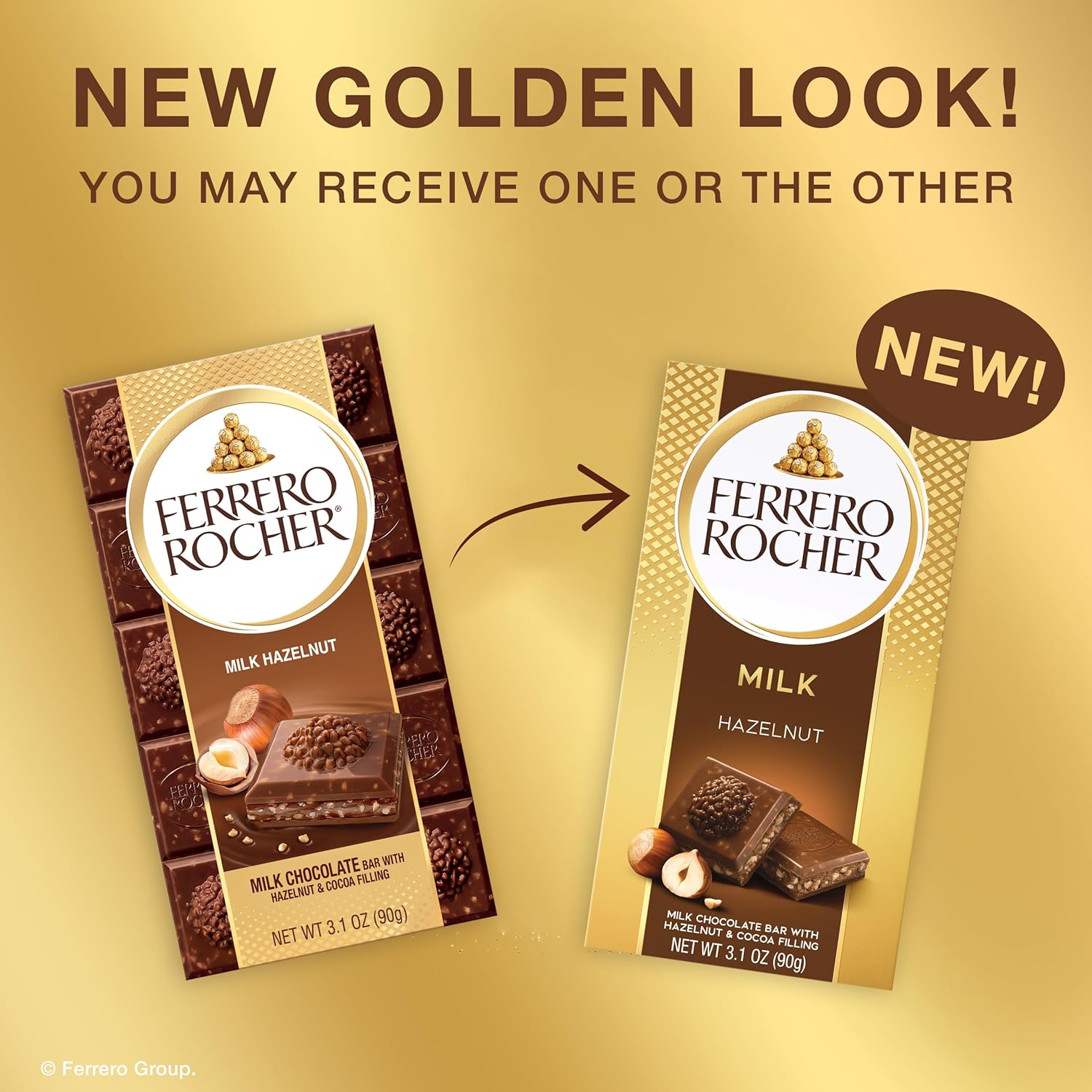 FERRERO ROCHER BAR: Enjoy a 3.1 oz Ferrero Rocher Premium chocolate bar, crafted with smooth milk chocolate, crunchy hazelnut pieces and filling, all wrapped in elegant gold foil