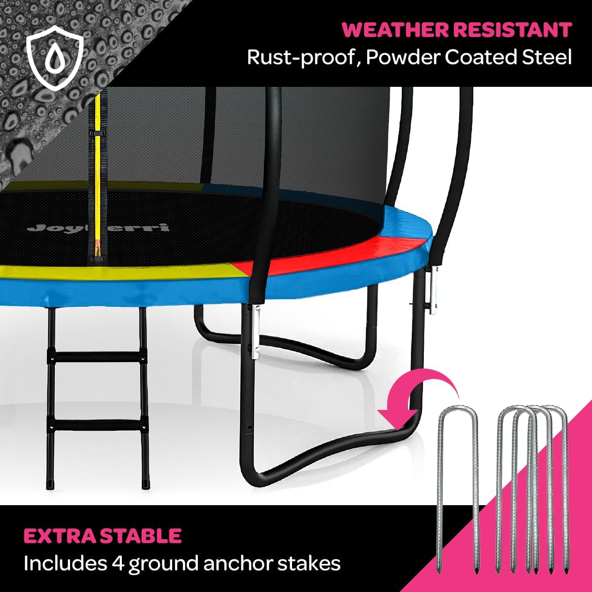 JoyBerri Trampoline Outdoor – ASTM Certified Safe, 8Ft, 10Ft, 12Ft, 14Ft, 15Ft, 16Ft Recreational Trampoline for Kids and Adults. Anti-Rust Coating with Enclosure Net, Ladder, Sprinkler & LED Lights