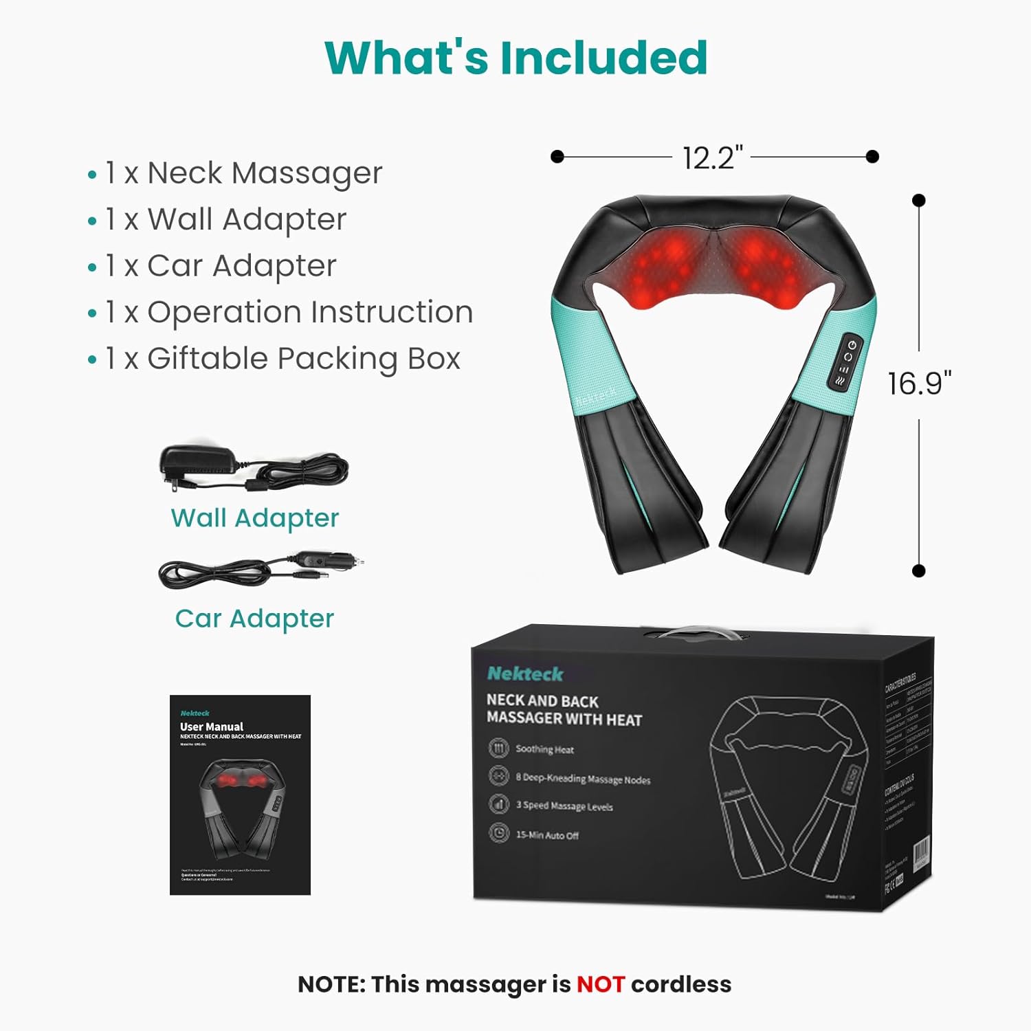 Nekteck Shiatsu Neck and Back Massager with Soothing Heat, Electric Deep Tissue 3D Kneading Massage Pillow for Shoulder Leg Full Body Muscle Pain Relief, Car Office and Home Use