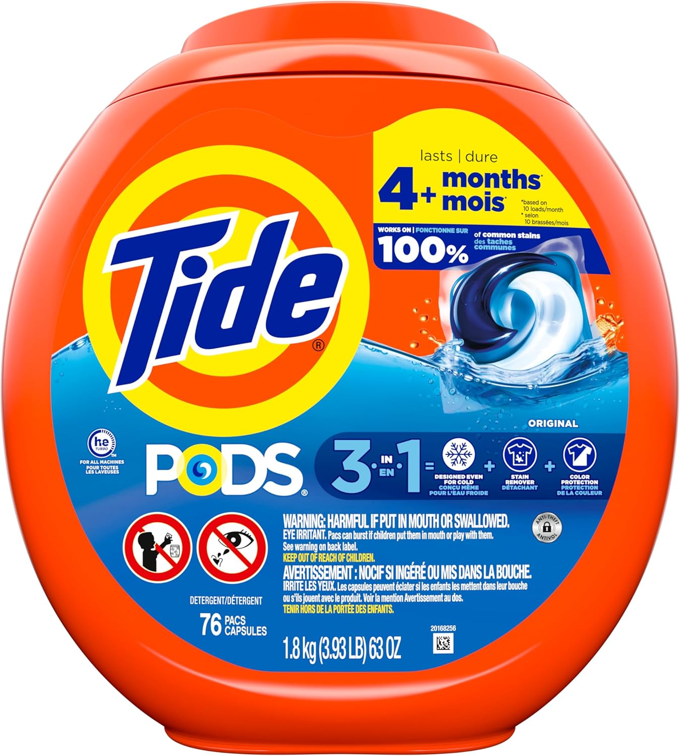 Discover the effortless, powerful clean of Tide PODS laundry detergent pacs, designed to work on 100% of common stains, even in cold water. With a 3-in-1 concentrated formula that combines stain removers, odor fighters, and color protectors, you get exceptional cleaning performance in just one simple step. Tide PODS laundry soap dissolves quickly, activating stain removal and odor fighting in any wash temperature. Say goodbye to grease stains and hello to fresh, vibrant laundry with America’s #1 trusted laundry brand*. Don’t pay for water, pay for clean. Tide PODS laundry soap is concentrated with 3X cleaning ingredients per dose compared to leading bargain liquid detergent, ensuring you get the most out of every load. Just toss Tide PODS laundry soap into the drum before adding clothes, it’s that easy For larger or heavily soiled loads, simply add another Tide POD. Transform your laundry routine with the trusted freshness of Tide Original scent. Get the clean you love, effortlessly in 1 wash with Tide PODS, your 3-in-1 laundry solution. Experience the power of Tide today Please keep Tide PODS stored out of reach of children and pets. *Voted most trusted laundry brand by American shoppers based on the 2025 BrandSpark American trust survey.