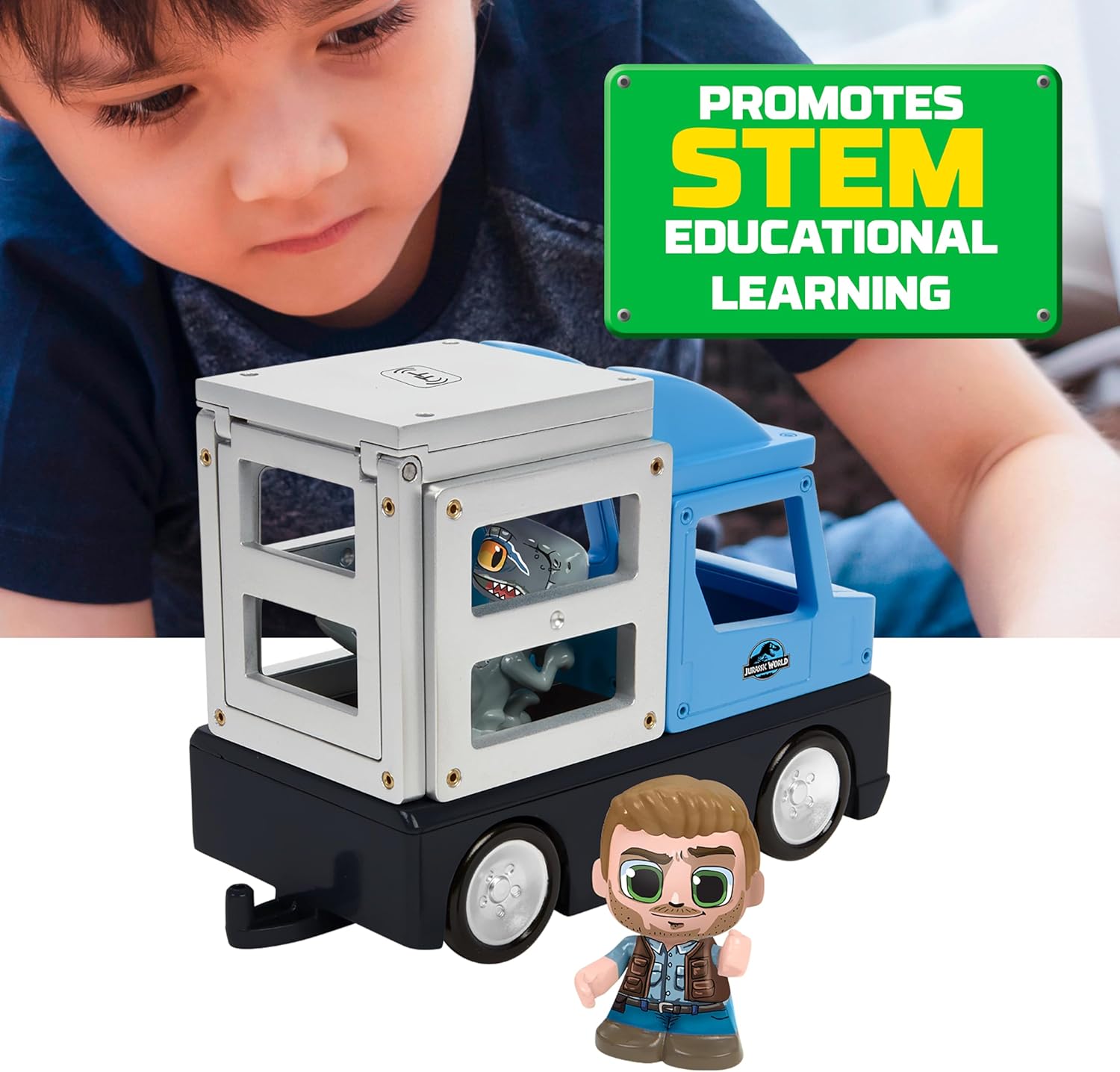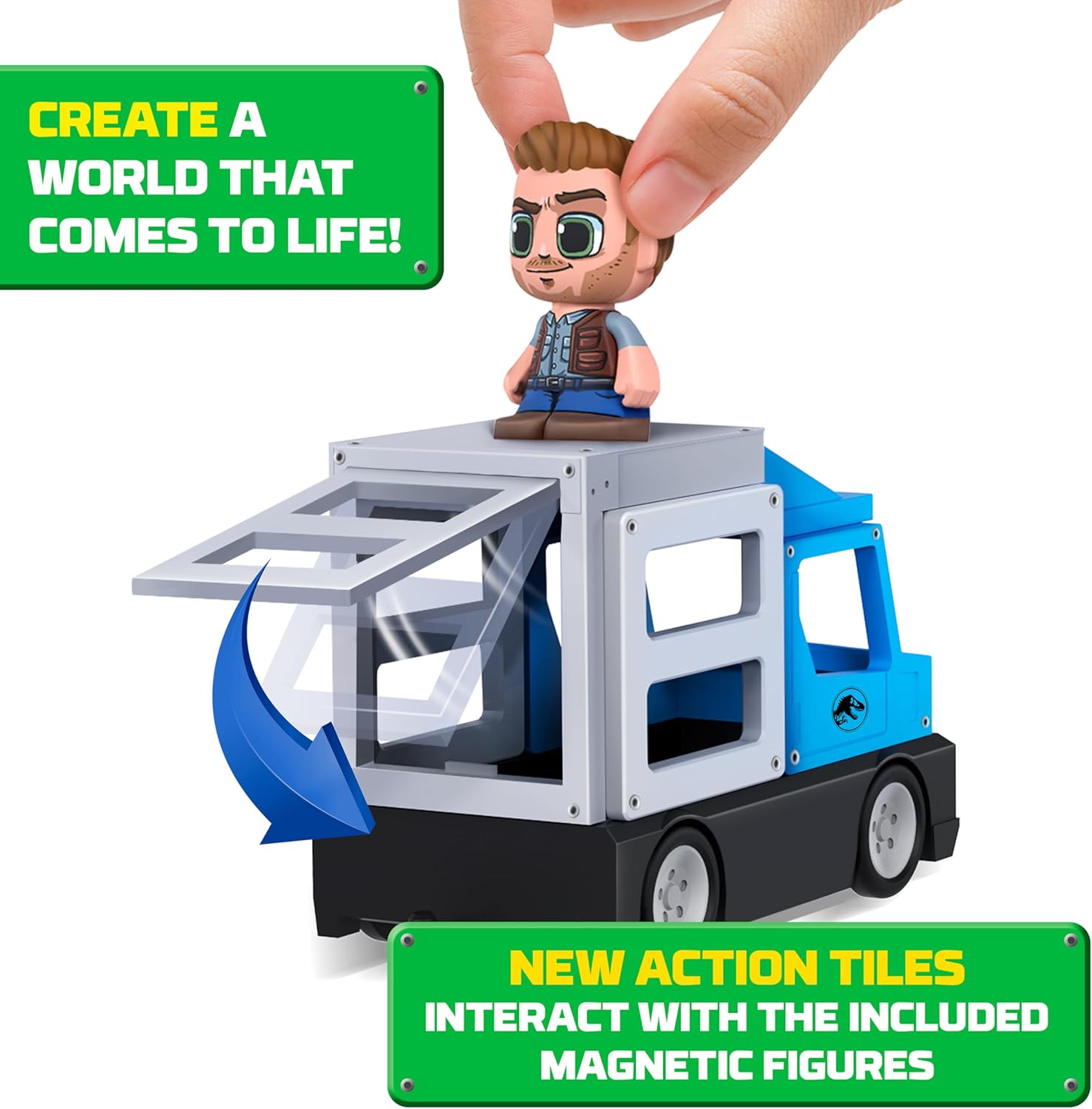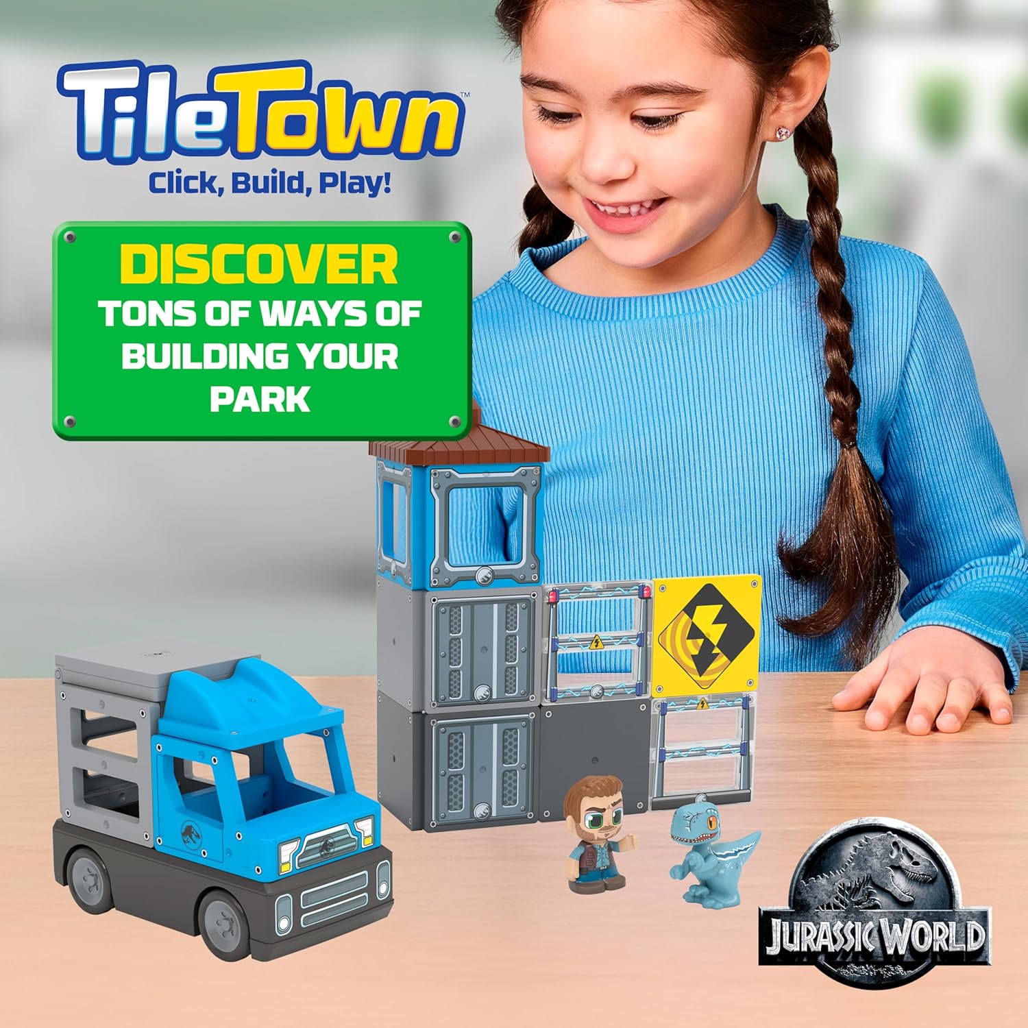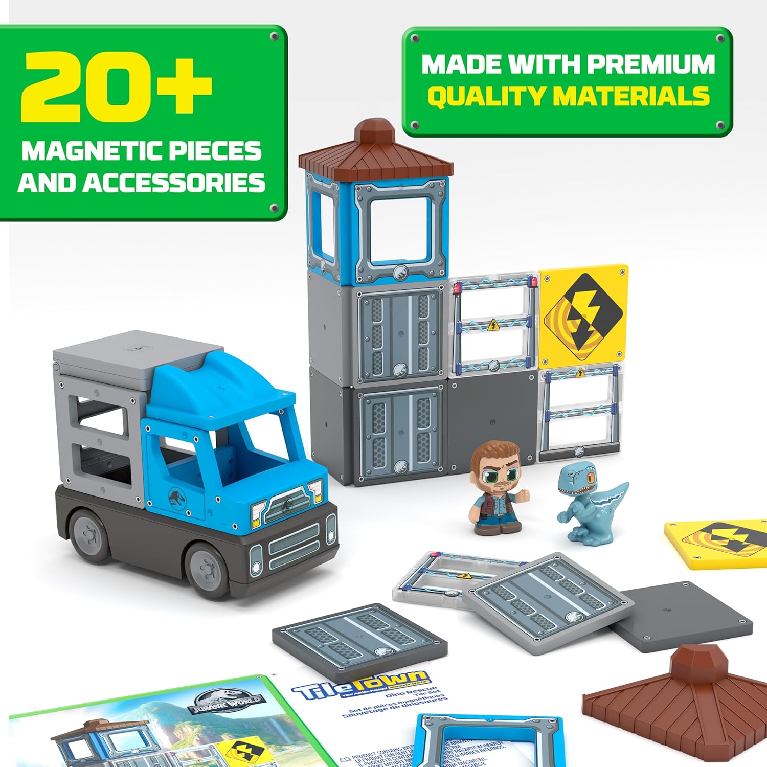 Tile Town Jurassic World Dino Escape Magnetic Tile Set: Transform your playroom into an epic adventure with our Dino Escape building dinosaur toys playset. This 22-piece magnetic dinosaur toys set—featuring 17 magnetic tiles, 2 action tiles, 2 figures, and 1 vehicle along with an instruction manual—encourages children to build sprawling Jurassic landscapes. Bring these landscapes to life by activating the magnetic play tiles to capture Blue the Raptor inside the cage on the truck while setting off the warning sign. Crafted from durable and safe materials, these tile magnets for kids inspire hands-on exploration of basic STEM principles, including problem-solving, spatial reasoning, and creative storytelling. Ideal for ages 3 and up, this magnetic tiles playset blends imaginative fun with educational value.